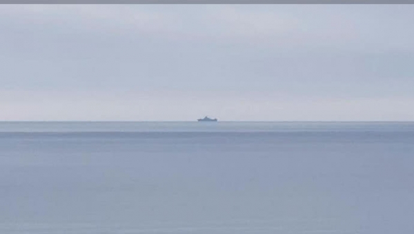 Российский ракетный фрегат, движется в направлении Азовского моря примерно за 1,5 морских миль (2,4 км) от побережья оккупированной Россией Феодосии.