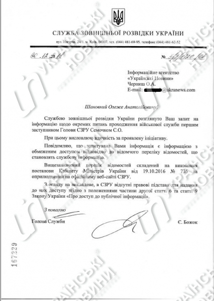 СВРУ отказалась предоставлять информацию относительно денежного обеспечения, полученного первым заместителем руководителя службы Сергеем Семочко с момента назначения на должность и посоветовала обращаться лично к нему.