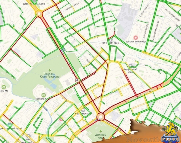 Согласно данным сервиса "Яндекс.Пробки", на Киевской в районе ДТП образовалась пробка. Скорость движения здесь минимальная.
