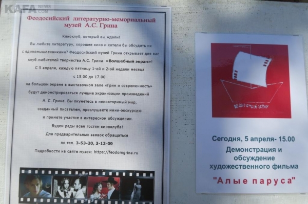 В пятницу, 5 апреля в феодосийском литературно-мемориальном музее Александра Грина был дан старт киноклубу «Волшебный экран». Теперь каждую первую и вторую пятницу месяца в выставочном зале «Грин и современность» для любителей хорошего кино и литературы на большом экране будут демонстрироваться лучшие экранизации сочинений Александра Степановича.