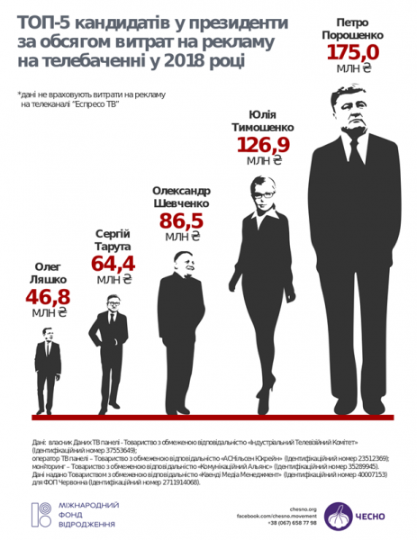 По подсчетам движения, только на телерекламу Порошенко потратил 175 миллионов гривен. Однако расходы на наружную рекламу и рекламу в Facebook в декларации не указаны.