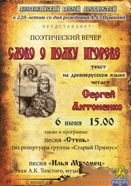 В этот день в 15.00 в Феодосийском музее древностей пройдет поэтический вечер, на котором будет представлена небольшая авторская программа, посвящённая древнерусскому литературному памятнику XII столетия, мировому шедевру – «Слову и полку Игореве».