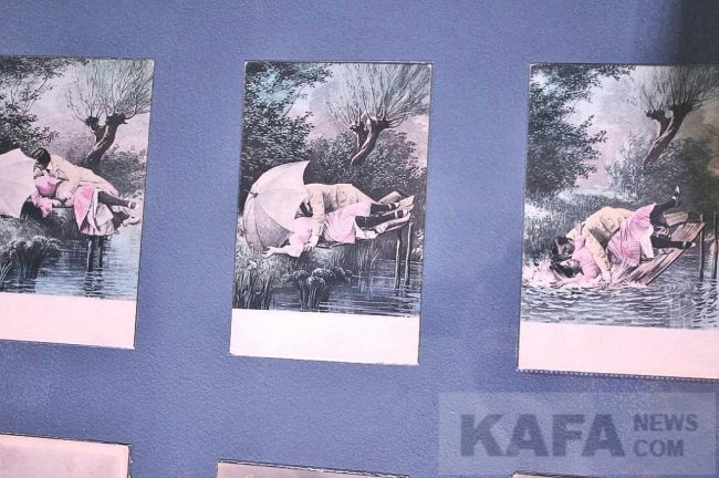На выставочных стендах – тематические подборки. Живопись, шляпы, прически, наряды, костюмы. Текстовые открытки с коротким обращением. Открытки с именами. Открытки на бархате, вышитые вручную, на металле, на шпоне, на ткани. Уникальная открытка с приклеенным кусочком бархата, на который девушка, отправляя ее молодому человеку, капала немного духов.