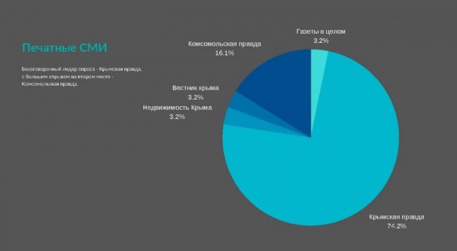 Безоговорочным лидером в опросе, каким печатным СМИ доверяют крымчане, стала «Крымская правда» (74,2%), на втором месте с большим отрывом - «Комсомольская правда» (16,1%).