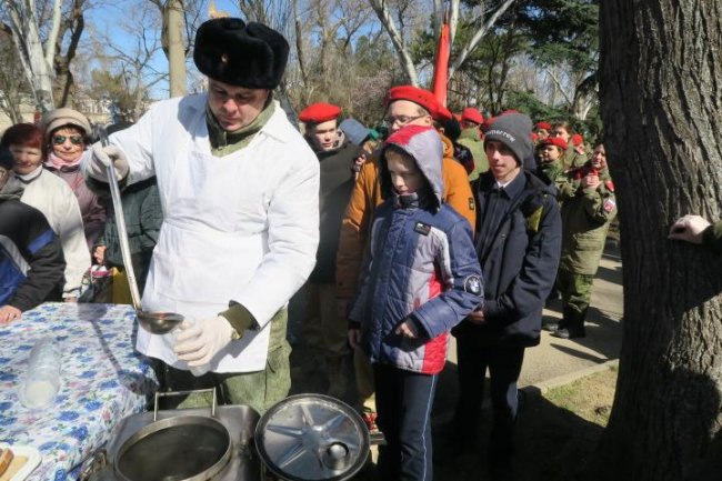 Далее «Эстафета Победы» переместилась на площадь перед кинотеатром «Крым», где расположилась выставка военной техники, вооружения и артефактов, связанных с Великой Отечественной войной. Все желающие также смогли отведать солдатской каши с горячим чаем из военно-полевой кухни.