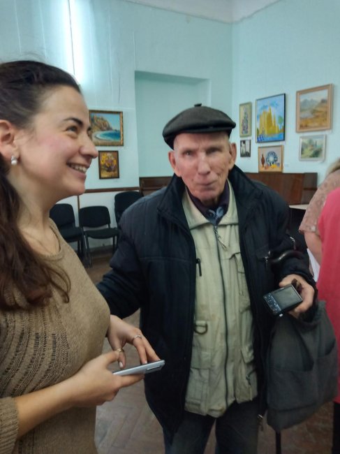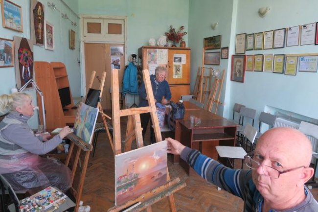 Владимир Астафьев тоже ветеран художественного фронта, ему 87 лет. Портрет коллеги из союза художников «Кафа» Татьяны Петровой, названный Владимиром Ивановичем «Художница у мольберта» - самое яркое «пятно» экспозиции.
