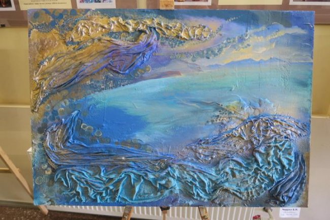 Как поведала Елена Петровна, полтора десятка выставленных здесь картин выполнены и в традиционной живописной манере, и в экспериментальных техниках. Живопись маслом Макса Крамарова, например, напоминает батик - роспись по ткани и смотрится как декоративно-прикладное произведение. Так же как и объемная работа самой Черуха, где ткань использована не как основа для письма, а наряду с красками в виде основного средства визуализации задуманного образа.