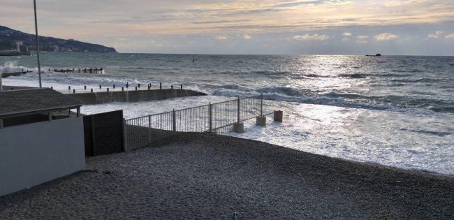 На фотографиях Приморского пляжа Ялты видно, что часть гальки смыло в море, площадь пляжной зоны заметно уменьшилась.