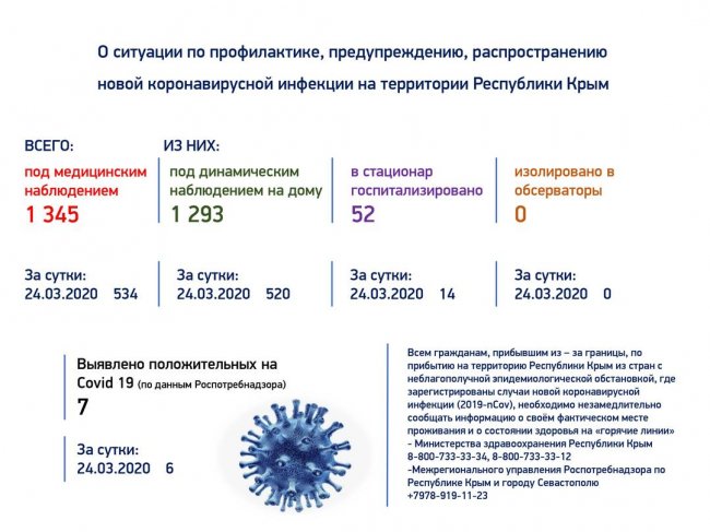 На сегодня по данным ежедневного мониторинга эпидемической обстановки о случаях выявления новой коронавирусной инфекции (2019-nCov) в Республике Крым среди лиц, прибывающих из зарубежных стран, под медицинским наблюдением находятся 1345 человек. Из них под динамическим наблюдением на дому находится 1293 человека, в стационар госпитализировано 52 человека. Выявлено 7 положительных на Covid-19. Лабораторные исследования в Республике Крым по коронавирусу проводятся на базе ФБУЗ «Центр гигиены и эпидемиологии РК и г. Севастополя». На территории республики реализуются усиленные меры по недопущению завоза и распространения вируса.