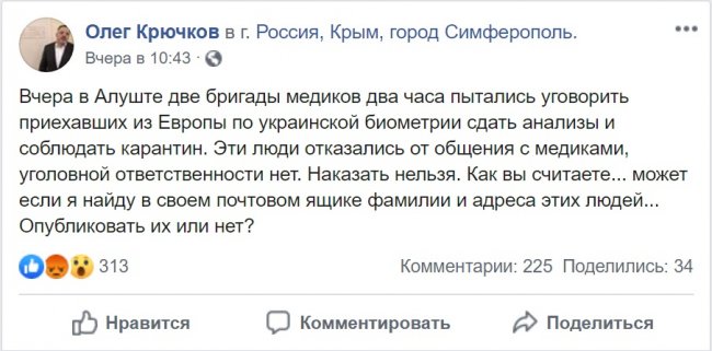 Этот телевизионщик утром 24 марта опубликовал на своей странице в Facebook сообщение, которое вы можете увидеть ниже. Одновременно с этим глава Крыма объявил, что в регионе еще шесть человек заразились коронавирусом, четверо из которых — члены одной семьи, вернувшейся из путешествия по ОАЭ.
