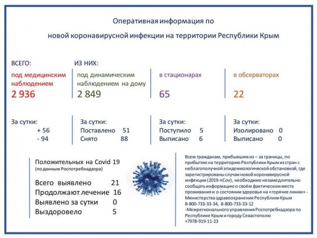 По данным ежедневного мониторинга по сложившейся ситуации с новой коронавирусной инфекцией в Республике Крым, под медицинским наблюдением находятся 2936 человек. Из них под динамическим наблюдением на дому находится 2849 человек, в стационарах находятся 65 человек, изолировано в обсерваторы – 22 человека. По данным Роспотребнадзора, всего выявлено 21 положительных на Covid-19. Выписано - 5. На территории республики реализуются усиленные меры по недопущению завоза и распространения вируса.