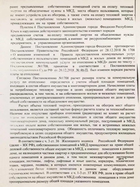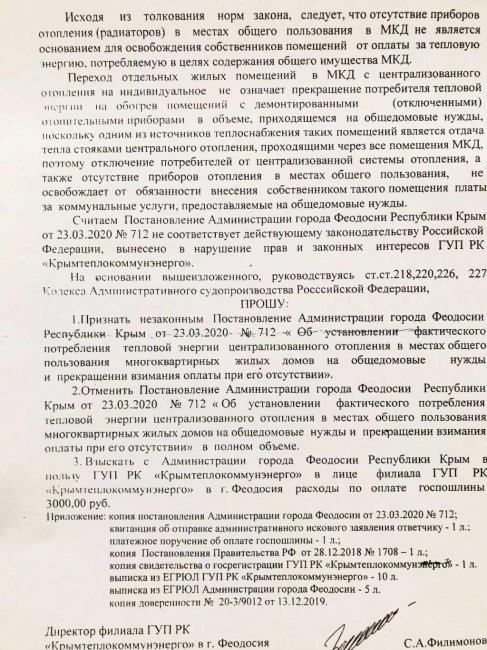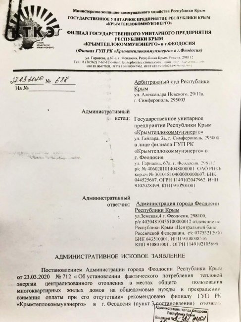 27 марта феодосийский филиал «Теплокоммунэнерго» подал административный иск в Арбитражный суд Крыма. В иске «тепловики» просят признать незаконным и отменить Постановление феодосийской администрации от 23.03.2020 №712 «Об установлении фактического потребления тепловой энергии централизованного отопления в местах общего пользования многоквартирных жилых домов на общедомовые нужды и прекращении взимания оплаты при его отсутствии».