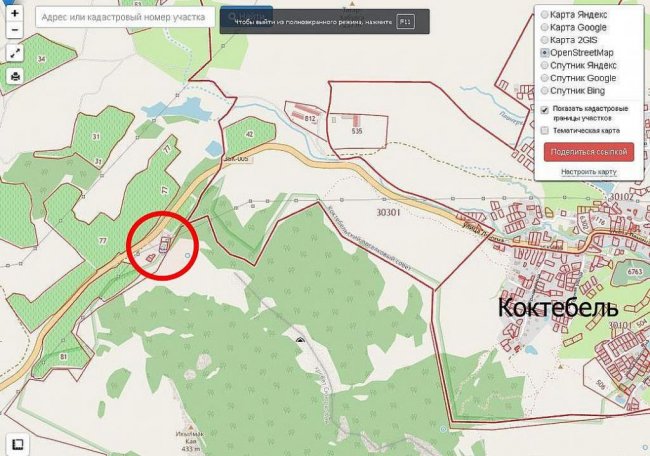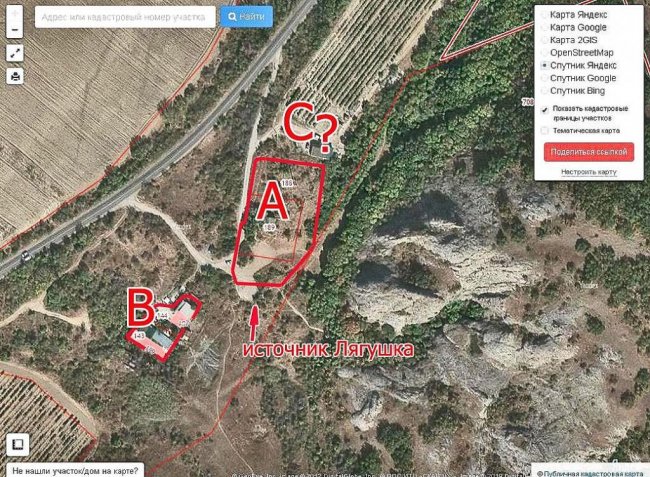 Рядом с двойным участком, вызвавшим скандальный резонанс (на карте отмечен буквой А – прим.), есть два участка с одноэтажными строениями. Со стороны Щебетовки (отмечен буквой В – прим.) - на двух соседних участках (по 5 соток каждый: № 143 – для ведения садоводства и № 144 для ведения дачного хозяйства). А со стороны Коктебеля дом (отмечен буквой С – прим.), которого нет на кадастровой карте. В одном из комментариев под постом Артема Мельниченко говорится, что, по-хорошему, следовало бы вообще убрать от «Лягушки» всех троих землепользователей.