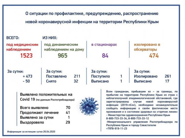 По данным ежедневного мониторинга по сложившейся ситуации с новой коронавирусной инфекцией в Республике Крым, под медицинским наблюдением находятся 1523 человека. Из них под динамическим наблюдением на дому находятся 965 человек, в стационарах находятся 84 человека, изолировано в обсерваторы – 474 человека. По данным Роспотребнадзора, всего выявлено 70 положительных на Covid-19. Из них на лечении 41 человек, выздоровело - 29.