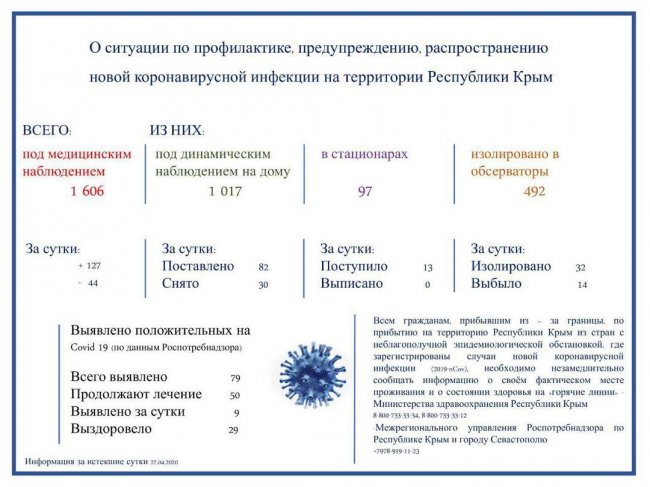 По данным ежедневного мониторинга по сложившейся ситуации с новой коронавирусной инфекцией в Республике Крым, под медицинским наблюдением находятся 1606 человек. Из них под динамическим наблюдением на дому - 1017 человек, в стационарах находятся 97 человек, изолировано в обсерваторы – 492 человека. По данным Роспотребнадзора, всего выявлено 79 положительных на Covid-19. Из них на лечении 50 человек, выздоровело - 29.