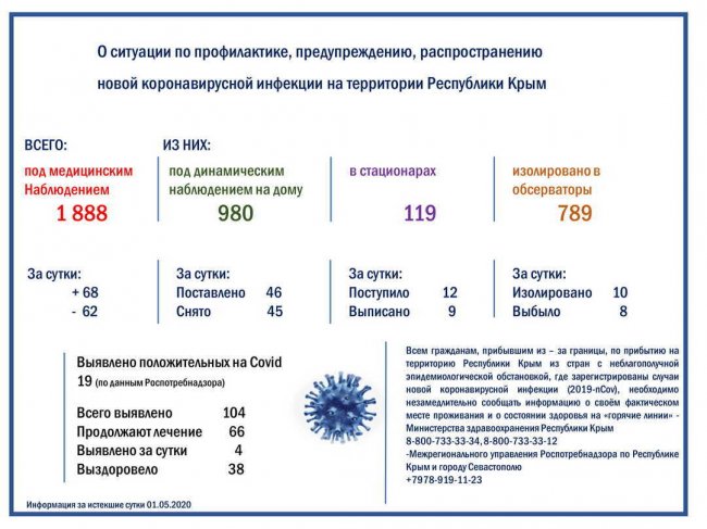 По данным ежедневного мониторинга по сложившейся ситуации с новой коронавирусной инфекцией в Республике Крым, под медицинским наблюдением находятся 1888 человек. Из них под динамическим наблюдением на дому находятся 980 человек, в стационарах находятся 119 человек, изолировано в обсерваторы – 789 человек. По данным Роспотребнадзора, всего выявлено 104 положительных на Covid-19. Из них на лечении 66 человек, выздоровело - 38.