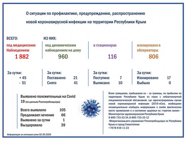 По данным ежедневного мониторинга по сложившейся ситуации с новой коронавирусной инфекцией в Республике Крым, под медицинским наблюдением находятся 1882 человека. Из них под динамическим наблюдением на дому находятся 960 человек, в стационарах находятся 116 человек, изолировано в обсерваторы – 806 человек. По данным Роспотребнадзора, всего выявлено 105 положительных на Covid-19. Из них на лечении 66 человек, выздоровело - 39.