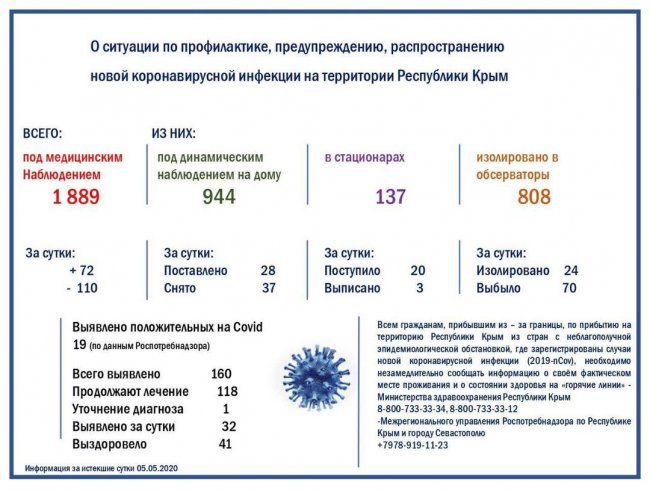 По данным ежедневного мониторинга по сложившейся ситуации с новой коронавирусной инфекцией в Республике Крым, под медицинским наблюдением находятся 1889 человек. Из них под динамическим наблюдением на дому - 944 человека, в стационарах находятся 137 человек, изолировано в обсерваторы – 808 человек. По данным Роспотребнадзора, всего выявлено 160 положительных на Covid-19. Из них на лечении 118 человек, выздоровело - 41.