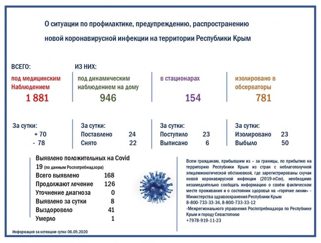 По данным ежедневного мониторинга по сложившейся ситуации с новой коронавирусной инфекцией в Республике Крым, под медицинским наблюдением находятся 1881 человек. Из них под динамическим наблюдением на дому - 946 человек, в стационарах находятся 154 человека, изолировано в обсерваторы – 781 человек. По данным Роспотребнадзора, всего выявлено 168 положительных на Covid-19. Из них на лечении 126 человек, выздоровело - 41.4