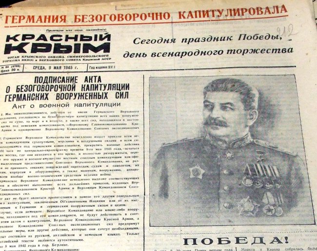 Битва под Москвой, 900 дней блокады Ленинграда, больше 250 - обороны Севастополя, Керченско-Феодосийский десант, Крымский фронт, Аджимушкайские каменоломни. Харьковский котёл, Ржев и Вязьма, Миус-Фронт, Сталинград, Курская дуга, Новороссийск, Донбасс, Заполярье… Тяжёлые шаги к Победе. Освобождение Европы, Красное Знамя над рейхстагом. Десятки миллионов погибших, тысячи разрушенных сёл и городов - боль и память. «В ознаменование полной Победы над Германией сегодня, 9 мая, в 22 часа Москва от имени Родины салютует доблестным войскам Красной Армии, кораблям и частям Военно-Морского Флота, одержавшим эту блестящую победу, - 30 артиллерийскими залпами из тысячи орудий. Вечная слава героям, павшим в боях за свободу и независимость нашей Родины! Да здравствуют победоносные Красная Армия и Военно-Морской Флот!» - Верховный Главнокомандующий Маршал Советского Союза Иосиф Сталин.