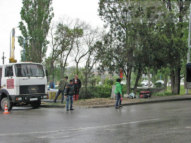 Несмотря на дождь, рабочие вот-вот установят памятный знак на постамент, работа кипит. Разработку дизайна, изготовление памятного знака и его установку выполняет фирма «Инвестстрой». Смотрится красиво, отнеслись к работе ответственно. Работы по изготовлению и установке велись около двух недель. Удачно выбрано место – на развилке Керченского и Феодосийского шоссе. здесь ранее была установлена рекламная конструкция, сейчас она демонтирована. Теперь все наши гости, въезжающие в город со стороны Симферополя, проникнутся героическим статусом Феодосии.