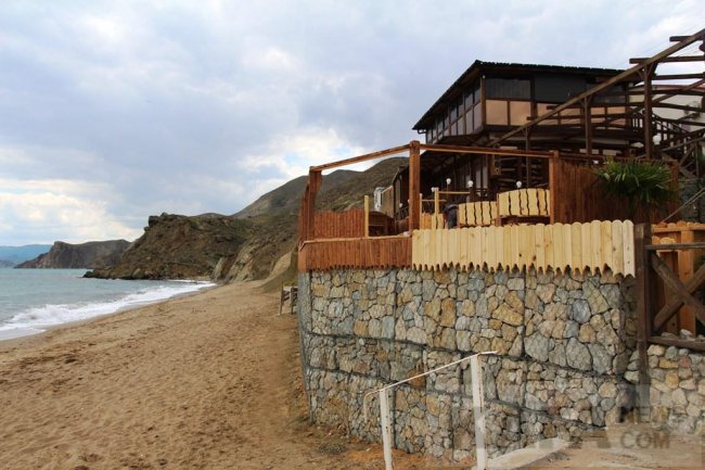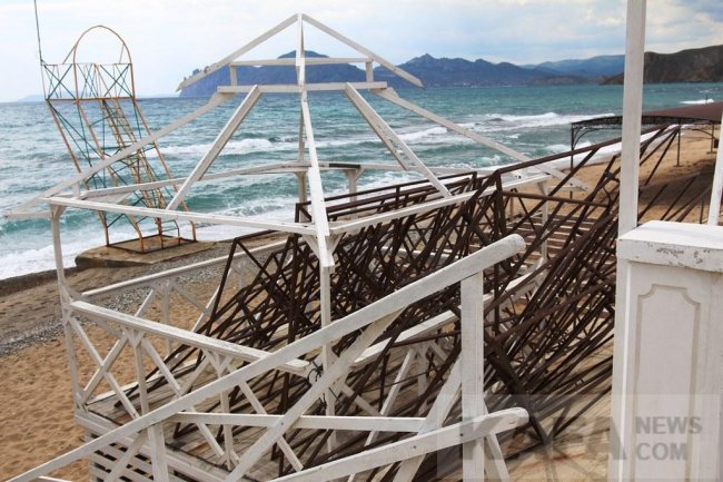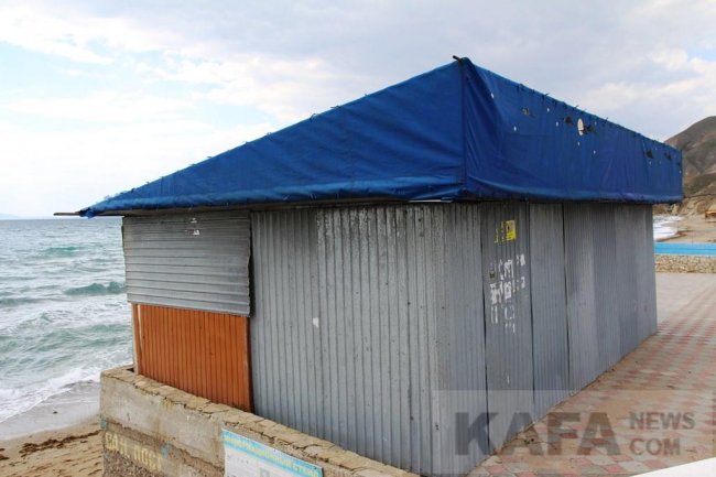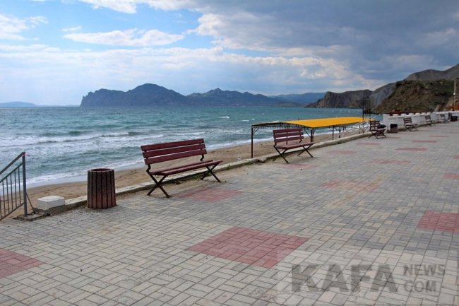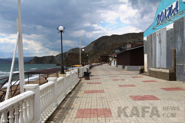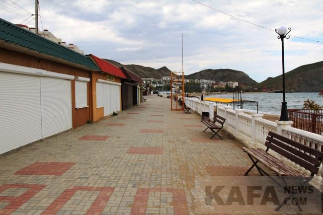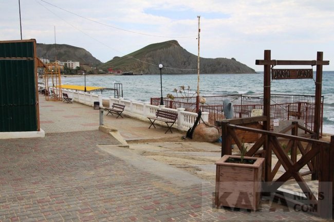 Набережная открыта, но на ней никого нет. Ни одно заведение не работает. Набережная напоминает не место отдыха и прогулок, а законсервированную стройку. Большинство кафе забиты листами металлической вагонки. Парапет, поврежденный во время февральского шторма, о котором «Кафа» уже писала до сих пор не починили.