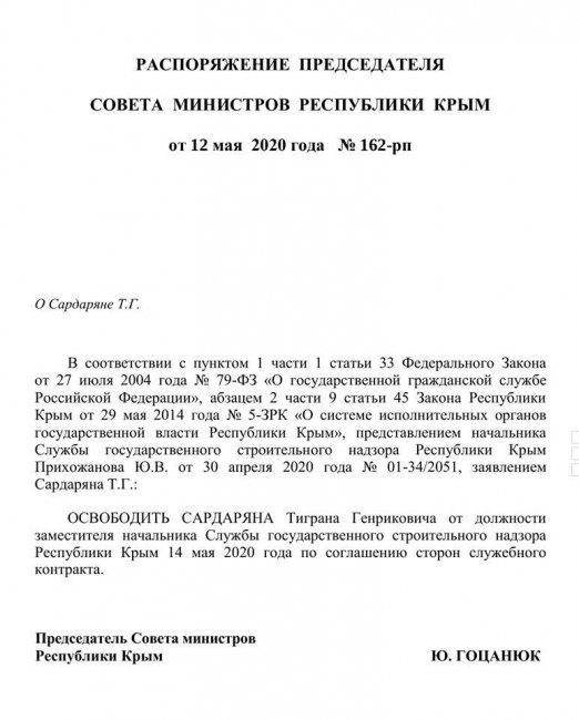Распоряжением Председателя Совета министров РК Юрия Гоцанюка №162-рп от 12 мая 2020 года Тигран Сардарян освобожден от должности заместителя начальника Службы госстройнадзора РК 14 мая 2020 года по соглашению сторон контракта.