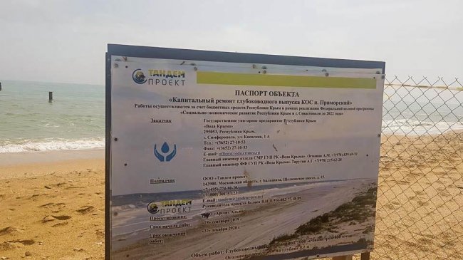 Согласно информационному стенду, обнаруженному общественником на месте проведения работ, действительно, осуществляется капитальный ремонт глубоководного выпуска КОС п. Приморский. Работы ведутся за счет бюджетных средств Республики Крым в рамках реализации Федеральной целевой программы «Социально-экономическое развитие РК и г. Севастополя до 2022 года».