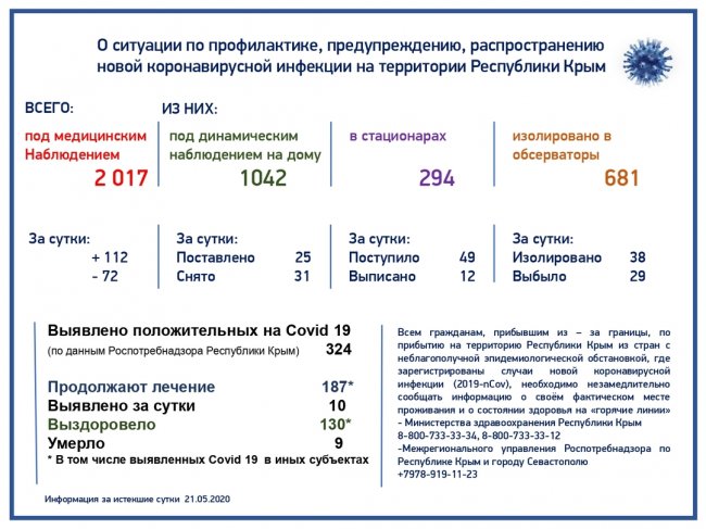 По данным ежедневного мониторинга по сложившейся ситуации с новой коронавирусной инфекцией в Республике Крым, под медицинским наблюдением находятся 2017 человек. Из них под динамическим наблюдением на дому находятся 1042 человека, в стационарах находится 294 человека, изолировано в обсерваторы – 681 человек. Межрегиональным управлением Роспотребнадзора по Республике Крым и городу Севастополю всего выявлено 324 положительных на Covid-19. Лечение в медицинских учреждениях Республики Крым проходят 187 человек, выписано с выздоровлением - 130.
