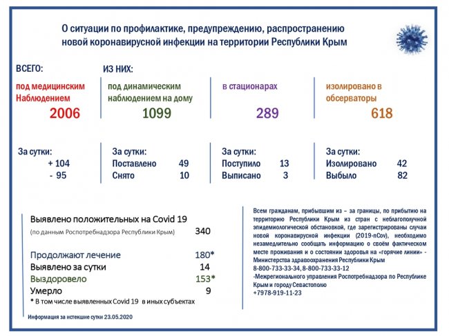 По данным ежедневного мониторинга по сложившейся ситуации с новой коронавирусной инфекцией в Республике Крым, под медицинским наблюдением находятся 2006 человек. Из них под динамическим наблюдением на дому находятся 1099 человек, в стационарах находятся 289 человек, изолировано в обсерваторы – 618 человек. Межрегиональным управлением Роспотребнадзора по Республике Крым и городу Севастополю всего выявлено 340 положительных на Covid-19. Лечение в медицинских учреждениях Республики Крым проходят 180 человек, выписано с выздоровлением - 153.