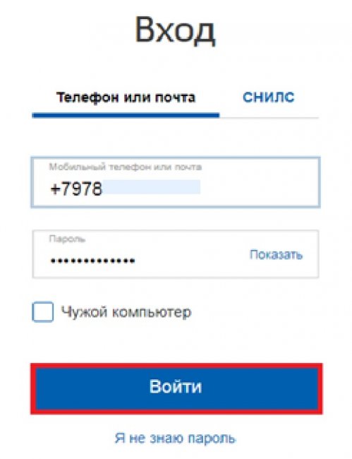 3. В следующем окне необходимо нажать кнопку «Вход» и ввести свои логин (в качестве которого выступают телефон, СНИЛС или e-mail) и пароль.