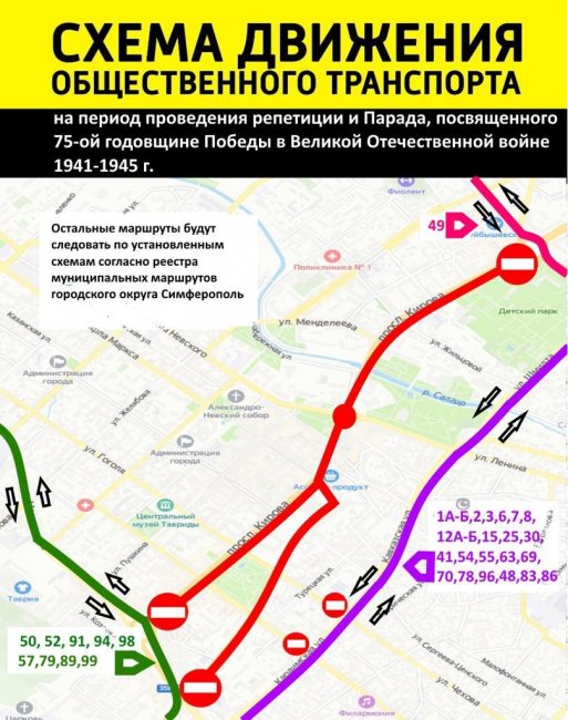 В Симферополе 18 июня с 18:00 до 22:00 и 20 июня с 08:00 до 13:00 будет перекрыто движение транспорта в связи с проведением репетиции Парада Победы в Великой Отечественной войне 1941-1945 годов. Так, движение будет ограничено на участке от пл. Амет-Хан Султана до пл. Куйбышева включительно; по улице Севастопольской (на участке от перекрестка ул. Севастопольской и ул. Козлова до пересечения ул. Севастопольской и пр. Кирова); улицам Турецкая (в районе пересечения с улицей С. Ценского) и Пушкина (в районе пересечения с ул. Самокиша). В указанный период времени на данных участках будет запрещена парковка транспортных средств, также будет организовано дежурство машины эвакуатора. На время проведения репетиции изменится схема движения транспорта и маршрутных транспортных средств. Движение общественного транспорта будет осуществляться: - по улицам Киевская, Шмидта, Пролетарская, Кавказская, Караимская (маршруты: 1 А-Б, 2 ,3, 6, 7, 8, 12 А-Б, 15, 25, 30, 41, 49, 50, 52, 54, 55, 63, 69, 70, 78, 81, 91, 94, 96, 98); - по улицам Павленко, Маяковского (маршруты: 1 А-Б, 4, 12 А-Б, 52, 59, 60, 61, 62, 67, 81, 98). По остальным маршрутам движение автобусов будут осуществляться согласно установленных схем движения. Также подготовлена схема объезда общественного транспорта на период проведения репетиции и парада: