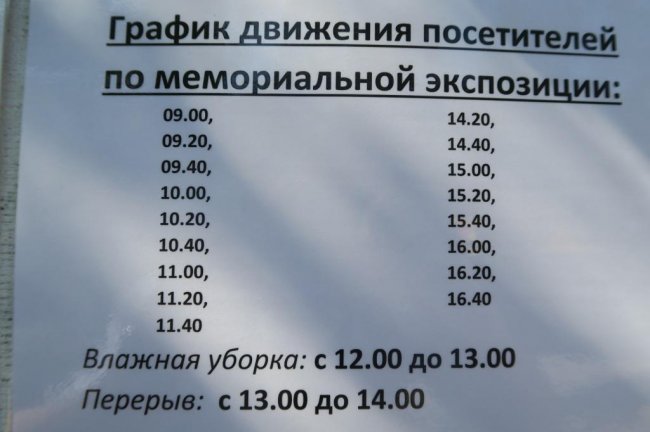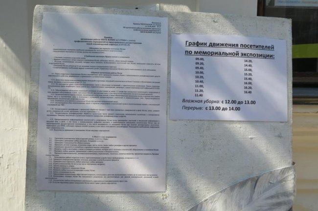 В период действия профилактических мер против распространения вирусной инфекции посещение музея проводится получасовыми сеансами. Согласно графику, начиная с 9 и до 17 часов, в музей с периодичностью в 20 минут запускают посетителей, но не более пяти человек в каждый зал. Перед влажной дезинфицирующей уборкой, на которую отведено время с 12 до 13 часов, последний вход в музей осуществляется в 11 часов 40 минут. После перерыва с 13 до 14 часов вход в музей снова открыт до 16 часов 40 минут. Касса работает с 9 часов до 12-30 и с 14-00 до 16 часов 30 минут. Выходные дни: понедельник и вторник.