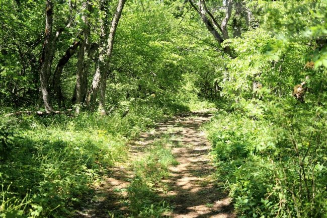 Продолжаем путь по хребту, в сторону Большого Агармыша. Подъем не сложный, сквозь заросли цветов, трав и кустарников. Вершина горы покрыта лесом из граба, дуба и бука. С 1975 года Агармышский лес признан памятником природы. Лес является природным водосбором, здесь остались следы средневекового водопровода, снабжавшего питьевой водой поселения в долине. Также в Агармышском лесу встречаются липа, вяз, ясень, клен, кизил, боярышник, а на открытых местах скумпия, шиповник и ежевика. Тропа идет в тени под пологом деревьев, но то здесь, то там выходит на открытые поляны. Несмотря на лесные заросли, складывается впечатление, что гора открыта всем ветрам, на все стороны света и наполнена воздухом. Особенно впечатляют виды, открывающиеся с Корабельного мыса. Почему такое название? Возможно, из-за схожести мыса с носом корабля или от того, что с него видна часть Феодосийского залива. Полюбовавшись видами с Корабельного вернемся в лес и начнем спуск в Волчий яр, в подземное царство Агармыша, к одной из наиболее доступных пещер. Всего их на горе больше десятка, большинство недоступны без специального снаряжения: «Драконья нора» с таврским святилищем, «Стонущая», где падающие капли издают звуки похожие на стоны, «Погреб» с кладом драгоценностей, найденным в XIX веке, пещера «Ломоносова» самая длинная на Агармыше глубиной 120 метров. В Волчьем яру расположена пещера «Лисий хвост». Начинается пещера узкой щелью, через которую можно с трудом протиснуться, но дальше узкий проход переходит в обширный зал. «Лисий хвост» имеет богатую историю: в 1905 году здесь находилась типография социал-демократов, а в 1943 году оружейный склад партизан. Поднявшись из Волчьего яра наверх и немного пройдя по лесной дороге, можно увидеть вход в еще одну агармышскую пещеру «Бездонный колодец». Это вертикальная шахта глубиной около 50 метров. Вход в нее заложен бетонной плитой с небольшим отверстием для спуска спелеологов. С пещерой «Бездонный колодец» связывают строки Овидия из «Метаморфоз»: