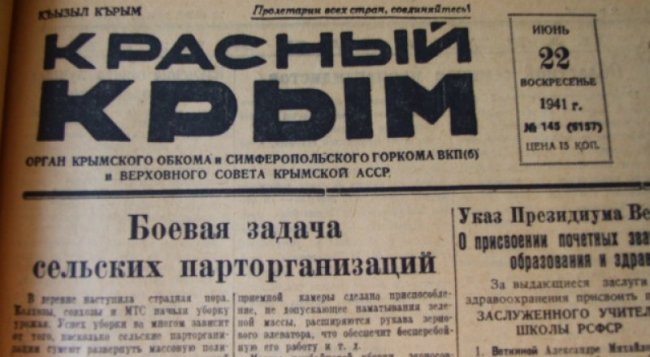 На редакционной планёрке в 8 утра наши коллеги во главе с редактором Евгением Степановым решили посвятить этому первую полосу следующего номера, на 23 июня. Сообщения о налёте в 3 часа 15 минут неизвестных самолётов на город, о сброшенных ими минах, о первых погибших, 21 мирном жителе с улицы Подгорной, в числе которых были и дети - Леночка Каретникова, 13 лет, Вадик Бабаев, 3 года, Виталик Годуадзе, 9 месяцев. Их передали наш спецкор Михаил Муцит (он погибнет за город потом) и собкор Леонид Дубнов. И новые сообщения, что получали газетчики по лентам ТАСС, будущий номер наполнялся страшным. Но крымчане, большинство, всё ещё жили мирными планами, ведь главная газета написала о созидании. Её напечатали до 3 часов утра, а потом до 6 утра развезли по регионам. Наша читательница Валентина Трофимовна рассказывает, что её отец Трофим Иванович Симаков в тот день как раз вёз «Красный Крым», воскресный свежий номер, в Армянск - в его крытой брезентом полуторке пачки газет лежали вместе с другой почтой, письмами, посылками. Водитель-экспедитор почты рассказывал, как выезжая на рассвете из Симферополя, видел зарево и «бело-тёмные облака» над Севастополем, что опускались всё ниже. Потом выяснилось, что это магнитные донные мины, спущенные врагом на парашютах. О них, об ответе наших зенитчиков, что сбили неизвестный самолёт, рассказал ему товарищ, возивший почту в Севастополь. Но о войне тогда всё равно не думалось, не верилось (ведь был договор о ненападении!). Многие надеялись, что просто учения. А потом наступил полдень, нарком иностранных дел Вячеслав Молотов произнёс по радио страшные слова: «Сегодня, в 4 часа утра, без объявления войны, германские войска напали на нашу страну».