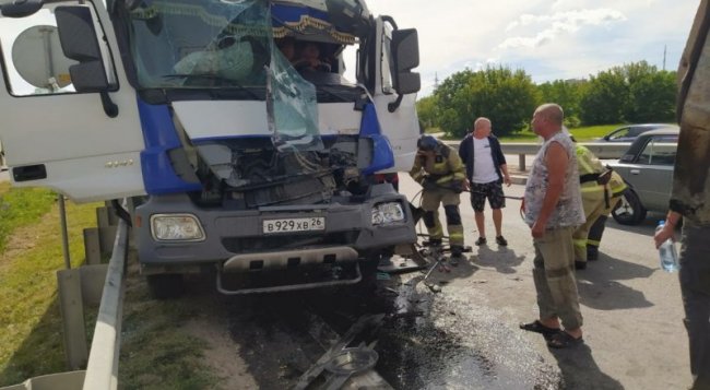 На место ДТП направлено отделение пожарно-спасательной части, аварийно-спасательное отделение и бригада скорой медицинской помощи. По прибытии на место было установлено, что дорожно-транспортное происшествие произошло в результате столкновения двух грузовых автомобилей.