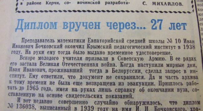 Материал для этой заметки нашим коллегам, возможно, передали сотрудники Крымского педагогического института имени Михаила Фрунзе. Ведь речь шла об их находке. Иван Иванович Бочковский, преподаватель математики Евпаторийской средней школы №10, окончил Крымский педагогический институт в 1938-м. Но, по каким-то причинам, на руки ему тогда выдали только временное удостоверение выпускника. Потом молодого учителя призвали в армию, война. Нам удалось найти страничку, посвящённую Ивану Ивановичу в проекте «Бессмертный полк. Евпатория», которую создала его дочь Татьяна. Увы, фотокарточки там нет, но зато указана дата рождения - 8 марта 1916-го. Данные о том, что младший сержант награждён 3 медалями и орденом Отечественной войны. В начале он воевал в 106-м полку, командир отделения связи, потом в белорусском партизанском отряде имени Кирова, политрук роты. После остался в Белоруссии, руководитель райкома Порозовского района Гродненской области. Потом вернулся в родной Крым, более 20 лет был завучем школы в Евпатории.