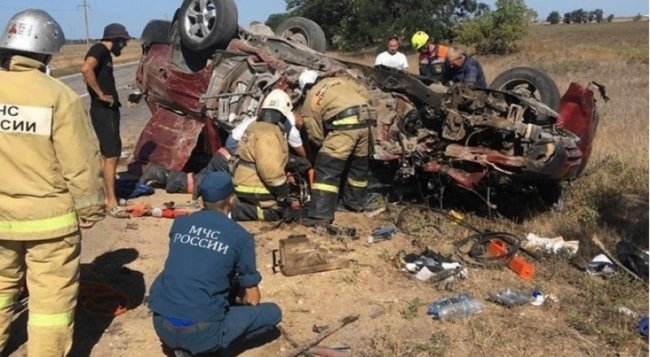 Фото пресс-службы ГУ МЧС по Республике Крым. На трассе Евпатория - Мирный в результате ДТП пострадали 6 человек, сообщили в пресс-службе ГИБДД МВД по Республике Крым. «15 августа около 9:00 на 9 км автомобильной дороги Евпатория – Мирный водитель автомобиля Kia выехал на полосу встречного движения и столкнулся с автомобилем SsangYong, который двигался из Евпатории в пгт Мирный», - говорится в сообщении. SsangYong вылетел за пределы дорожного полотна и опрокинулся. В результате лобового столкновения автомобилей пострадали 6 человек, в том числе ребенок 12 лет.