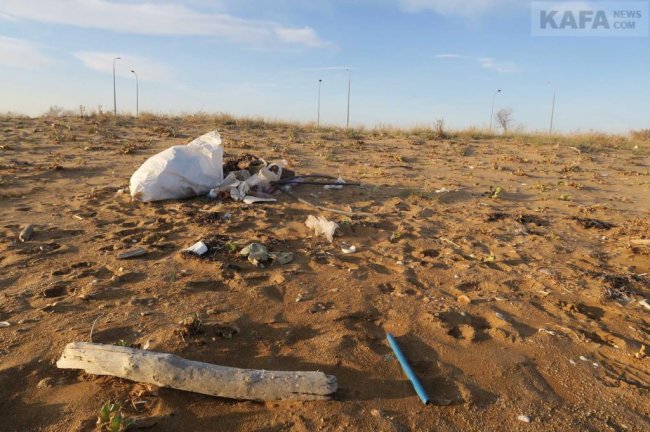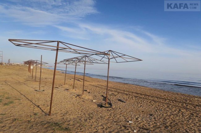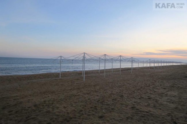 Пешеходы проходят мимо законсервированных на зиму пляжных объектов, каркасов зонтиков и беседок без крыш. По пути следования периодически попадаются мусорные скопления. А как же без мусора? Что-то выкинуло назад море, какой-то хлам принесли сюда люди. Не мало и следов от всесезонных пляжных выпивох. Бутылки, стаканы и прочие атрибуты стихийных алкопикников тут далеко не редкость.