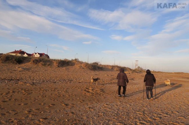 Феодосийский Золотой пляж в «разгар не сезона» умиротворен и тих, впрочем, наверное, как и любой другой зимний пляж. Но сказать, что здесь пустынно и безлюдно, тоже нельзя. Тут и рыбаки, и прогуливающиеся люди. С детьми, собаками и лыжными палками для скандинавской ходьбы. Все движение происходит в спокойном темпе. Спешить некуда, люди просто гуляют вдоль кромки моря.