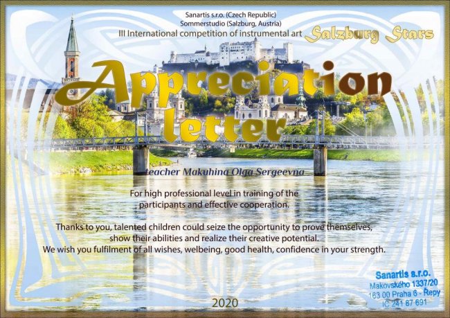 Конкурс «Зальцбургские звезды» - это важный этап в жизни маленького музыканта и его преподавателя, ведь их совместную работу оценивало серьезное именитое жюри: известный молдавско-американский пианист и дирижер Алекса?ндр Пале?й (Молдавия-США), пианист и преподаватель Музыкальной Академии Зальцбурга Джанфранко Санникандро (Италия), профессор и член правления Венского университета музыки и исполнительского искусства Томас Кройцбергер (Австрия), дирижер камерного оркестра и хора в Барселоне Хосе Мигель Миндан Сеуба (Испания) и композитор, пианист и дирижер старейшего европейского симфонического оркестра в Карловых Варах Ян Кучера (Чехия). Было очень приятно получить отзыв одного из членов жюри, Джанфранко Санникандро, в котором он отмечает большую проделанную работу, чистоту исполнения, прекрасную передачу характера и эмоции.