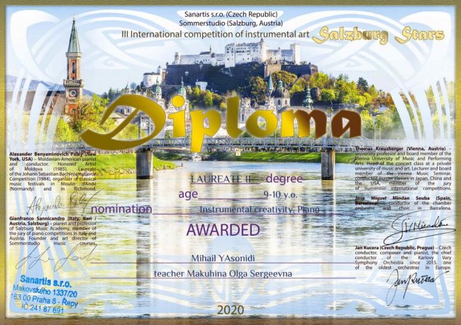 Новый год – время подведения итогов, время подарков и чудес. Настоящим новогодним подарком стали результаты III Международного конкурса инструментального творчества«Зальцбургские Звезды» для ученика Феодосийской детской музыкальной школы №2 Михаила Ясониди и его преподавателя Макухиной Ольги Сергеевны. Михаил стал лауреатом II премии! Феодосийский школьник стал лауреатом Международного конкурса инструментального творчества «Зальцбургские Звезды» Конкурс «Зальцбургские звезды» - это важный этап в жизни маленького музыканта и его преподавателя, ведь их совместную работу оценивало серьезное именитое жюри: известный молдавско-американский пианист и дирижер Алекса?ндр Пале?й (Молдавия-США), пианист и преподаватель Музыкальной Академии Зальцбурга Джанфранко Санникандро (Италия), профессор и член правления Венского университета музыки и исполнительского искусства Томас Кройцбергер (Австрия), дирижер камерного оркестра и хора в Барселоне Хосе Мигель Миндан Сеуба (Испания) и композитор, пианист и дирижер старейшего европейского симфонического оркестра в Карловых Варах Ян Кучера (Чехия). Было очень приятно получить отзыв одного из членов жюри, Джанфранко Санникандро, в котором он отмечает большую проделанную работу, чистоту исполнения, прекрасную передачу характера и эмоции. Конкурс создан в целях выявления и поддержки талантливой молодежи, популяризации искусства в его исполнительском и педагогическом аспектах, а также с целью открытия новых имен и талантов в области искусств, и проводится при поддержке таких европейских культурных организаций, как "Sommerstudio" (Salzburg, Austria) и "Sanartiss.r.o." (Praha, CzechRepublic). Хочется верить, что этот конкурс послужит хорошей мотивацией для дальнейшего творческого роста Михаила и вдохновит его и других музыкантов Феодосийской детской музыкальной школы №2 на новые творческие свершения. Былеева О.С.