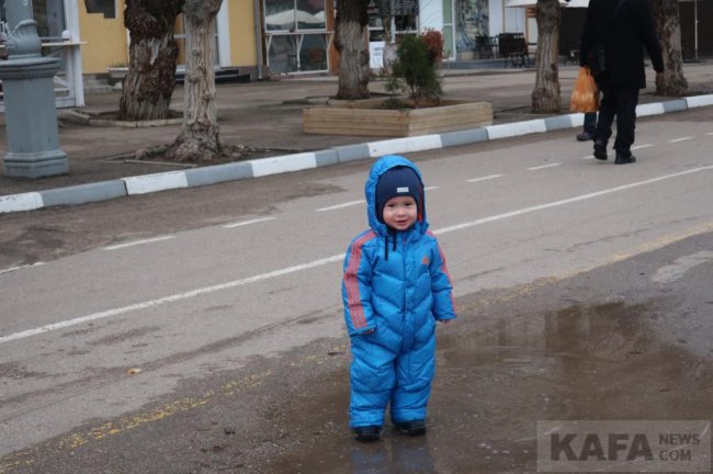 Детеныш в синем комбинезоне вдумчиво изучает глубину лужи недалеко от главной елки Феодосии. Лужа ничего себе так, хорошая: ребенку есть, где померить глубину.