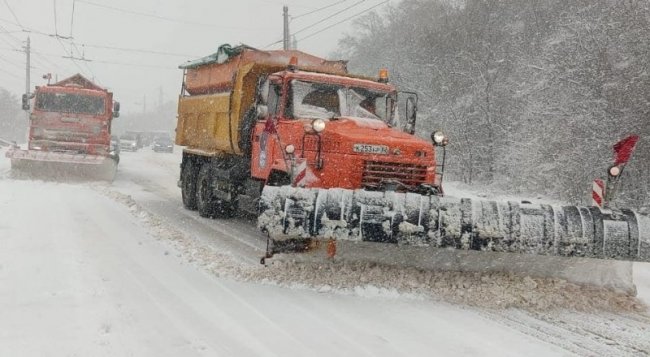 Фото: Служба автомобильных дорог Республики Крым/ВКонтакте В связи с обильным выпадением осадков в виде снега специалисты эксплуатирующих организаций проводят работы по очистке и противогололедной обработке автомобильных дорог Республики Крым. Об этом сообщили в Службе автодорог Крыма. «Дорожники продолжают следить за изменениями погоды и ведут постоянный мониторинг ситуации на дорогах. Работы по очистке и обработке дорог ведутся в круглосуточном режиме. За минувшие сутки очищено и обработано более 2300 км дорог, израсходовано - 2000 тонн противогололедного материала. Задействовано 145 человек, 95 единиц специализированной техники», - сообщили в пресс-службе. Напомним: по информации ФГБУ «Крымское управление по гидрометеорологии и мониторингу окружающей среды», в течении суток 17 января в Крыму ожидаются сложные погодные условия: снег, в центральных, южных и восточных районах очень сильный снег, местами метель, гололедно-изморозевые отложения, на дорогах гололедица; усиление северо-восточного ветра 20-25 м/с».