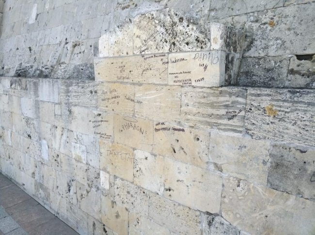 Стенка у памятного места расстрела революционных моряков крейсера «Очаков» в центре Севастополя, напротив памятника Затопленным кораблям, оказалась покрыта автографами учащихся некоторых школ Севастополя.