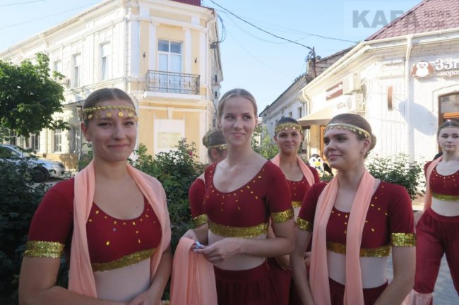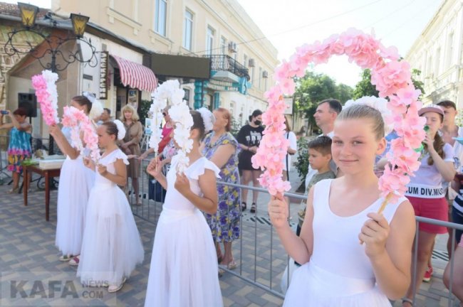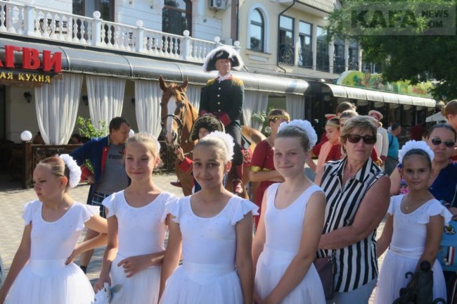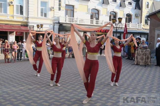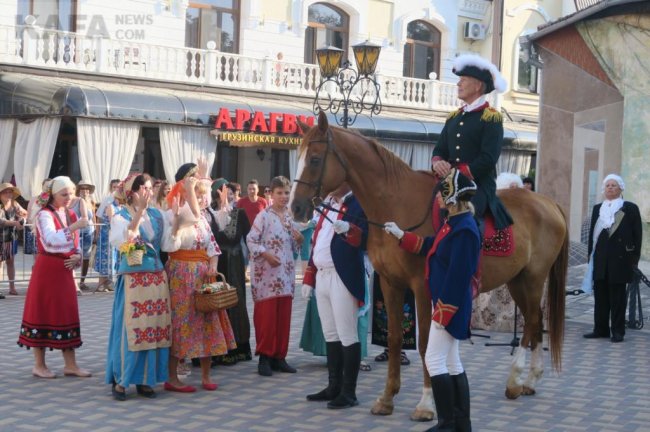 На Музейной площади было показано настоящее уличное представление под названием «Русская Таврида – геополитический проект Екатерины II». Театрализованная постановка началась с «голоса истории Крыма», озвученного ведущей праздничного вечера, актрисой феодосийского «Библиотеатра» Полиной Коцегуб: