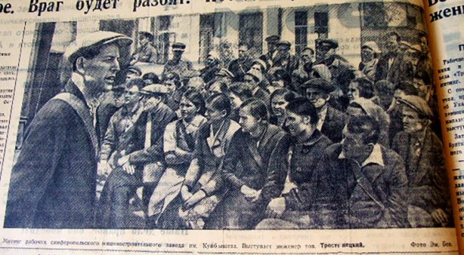 Дальше - только об успехах писали. Декабрь 1936-го: «Передовик коммунист Ляшенко с завода пищевого машиностроения имени Валериана Владимировича Куйбышева (так теперь называлось предприятие, а имя председателя Высшего Совета народного хозяйства, председателя комиссии советского контроля при Совнаркоме СССР, присвоено заводу после смерти большевика в 1935-м. - Ред.) выполняет свою норму на 350%». «Передовики производства симферопольского завода пищевого машиностроения» встали на предпраздничную вахту, посвящённую 20-летию Великой Октябрьской Социалистической революции», июнь 1937-го. «Больших успехов добились в уходящем году труженики завода пищевого машиностроения имени В. В. Куйбышева» - декабрь 1938-го. А вот уже снова наступают грозные времена: Великая Отечественная война. На крымских предприятиях - митинги, люди только что услышали сообщение о вторжении фашистов в нашу страну. 24 июня 1941-го газета опубликовала заметку Моисея Хенкина - «Голос великого народа». «На заводском дворе к столу, покрытому красной материей, группами и в одиночку подходят люди. С возмущением и гневом говорят о наглом нападении фашистских агрессоров. Председатель заводского комитета машиностроительного завода имени Куйбышева товарищ Кудибал объявляет заводской митинг открытым. С сообщением выступил товарищ Глузман. Слово взял инженер завода товарищ Гростинецкий (Тростенецкий - так фамилия указана под фото Эммануила Бендицкого). «Мы помним дни борьбы с белофиннами. Доблестная Красная Армия и Военно-Морской Флот неоднократно показали всему миру, как борется за свою Родину советский народ. И в этой навязанной нам фашистскими агрессорами войне мы покажем свою неизмеримо возросшую силу и мощь, сплочённость и организованность вокруг партии большевиков, советского правительства и великого Иосифа Сталина». Под аплодисменты и возгласы «ура» митинг рабочих, инженерно-технических работников и служащих завода имени Куйбышева принял резолюцию, в которой говорится: «Свою преданность и любовь к партии и Родине мы докажем самоотверженной работой на производстве, высокой трудовой дисциплиной. Заверяем, что мы все свои силы отдадим за Родину, за партию». Спустя три дня газета рассказывает уже о том, что многие мужчины завода ушли на фронт, а на их место становятся женщины. «Много мужчин-рабочих уже призваны в ряды Красной Армии. На заводе их с успехом заменяют женщины. Завод переключился на широкую подготовку женщин-токарей. <> Одной из самых трудных специальностей считается работа наладчиков. Раньше эту работу в большинстве исполняли мужчины, теперь после окончания первой смены ряд женщин-токарей высокой квалификации цеха №2 учится налаживать станки. Опыт подхватили и другие. Станочницы переводятся в чистовое отделение на ручную, окончательную обработку продукции - также один из самых сложных цехов. Товарищи Хорсико, Славгородская, Гершова, Грищенко и другие уже перевыполняют нормы в этой новой для них области производства. По заводу разворачивается движение многостаночниц. Комсомолка товарищ Лимарь обслуживает три станка и перевыполняет норму. Перевыполняют нормы и товарищи Вовк, Морозова, Аксёнова, Шокарева - на 200-250%. Товарищ Верхотина работает на одной из важнейших операций - запрессовке, средняя норма её выработки - 350%. Женщины завода не только блестящ