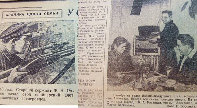 Герой публикации в бою и дома. Автора. Это сейчас в газете есть рубрика «Судьбы людские», где рассказываем об интересных, сложных, красивых историях людей, семей, о жизни - она зародилась, наверное, в конце восьмидесятых прошлого века, а популярность набрала уже в этом веке, в двухтысячных. А вот в архивной подшивке почти 70-летней давности мы нашли иную рубрику для подобных материалов - «Хроника одной семьи», 23 декабря 1955-го она была посвящена освободителю полуострова от фашистов Фёдору Рязанцеву, его жене Марии и сыну Александру. Интересно, а читают ли сейчас «Крымскую правду» потомки снайпера и слесаря Фёдора Алексеевича? Как сложилась его дальнейшая судьба, кем стали его дети, внуки, продолжают ли славную трудовую династию? Надеемся, читатели помогут узнать об этом, а пока заглянем в архивные странички газеты. На фронте… Наш корреспондент Сергей Павлович Шантырь рассказ о главе семьи начал со сравнения - что изменилось за 12 лет для Фёдора Рязанцева - от войны до мира. «1943 год. старший сержант Рязанцев начал свой снайперский счёт уничтоженных гитлеровцев. 1955… В эти дни рядовой советский труженик Рязанцев рапортует Родине, что своё обещание трудиться, не покладая рук, он выполняет с честью. За пятилетку выполнил почти 9 годовых норм и сейчас трудится уже в счёт последних месяцев 1959 года. За успехи, достигнутые в социалистическом соревновании, он четырежды отмечался почётными грамотами, его имя занесено в заводскую Книгу почёта». А в апреле 1943 года дивизионная газета «Советский боец» опубликовала приказ командования 5-й ударной армии, в котором говорилось: «Старшему сержанту Фёдору Алексеевичу Рязанцеву, гвардии сержанту Андрею Ильичу Жидяеву (он после войны жил под Свердловском. - Ред.). Воины нашего участка фронта с интересом прочитали в газете «Советский боец» о ваших боевых успехах. Крепко вы бьёте фашистов, умело воюете. Родина гордится вами, богатыри! За отличную службу объявляем вам благодарность и желаем новых боевых успехов во славу Родины!». К тому моменту на счету у прославленного снайпера, кандидата в члены партии Фёдора Алексеевича Рязанцева было уже 113 уничтоженных фашистов, за что он был награждён орденом Красной Звезды. На портале «Память народа», созданном по документам Центрального военного архива Министерства обороны страны, мы нашли приказ о том ордене и наградной лист на снайпера 362-го стрелкового полка 315-й стрелковой дивизии красноармейца Фёдора Рязанцева, 1907 года рождения, призванного из Воронежской области. «В боях за село Русское Ростовской области снайпер Рязанцев выбрал для себя удобную огневую позицию и, хорошо замаскировавшись, с ненавистью и презрением брал фашистов на мушку своей винтовки. За период боёв с 23 по 25 февраля 1943 года из своей снайперской винтовки товарищ Рязанцев уничтожил 24 немецких солдата и офицера». А 10 мая 1944-го участнику боёв за Перекоп и Севастополь Фёдору Алексеевичу по приказу Верховного главнокомандующего Иосифа Виссарионовича Сталина была объявлена благодарность за отличные действия в боях за освобождение города русской славы. К тому времени на счету у знатного снайпера 4-го Украинского фронта было 227 уничтоженных фашистов. Коммунист Рязанцев был награждён орденом Красного Знамени. И снова строки наградного листа: «Снайпер старший сержант Рязанцев показал себя лучши