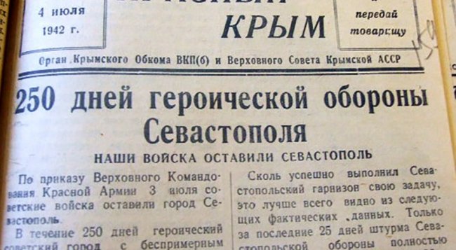 К тому времени наша газета, «Красный Крым», что с 30 октября 1941-го перебралась из Симферополя в Севастополь, уже покинула город-герой, оказавшись в Керчи, освобождённой в зимнем десанте. В майское падение Крымского фронта успели несколько коллег, точно знаем, что редактор Евгений Степанов и его зам Абрам Райчук, эвакуироваться на Кавказ. Но писать о родном полуострове не прекратили, а в Севастополе до последнего оставался спецкор Михаил Муцит, коллеги из других изданий, что часто писали и в нашу газету - Сергей Галышев, Лев Иш, Пётр Сажин (он единственный выживет тогда)… Город сражался. И 27 июня 1942-го «Красный Крым» писал: «Весь мир восхищается героическими делами защитников Севастополя, которые уже много дней отбиваются от яростных и беспрерывных атак десятка немецких дивизий, пятисот самолётов и многих сотен вражеских танков. <> И всё это время вместе с Красной Армией гитлеровских мерзавцев громят трудящиеся и домохозяйки Севастополя. <> Партизаны и партизанки, жители городов и сёл Крыма, временно захваченных фашистами, помогайте всеми силами отважным севастопольцам. Вместе с героями Севастополя сделайте всё, чтобы над твердыней Черноморья всегда реяло победное Красное знамя»…