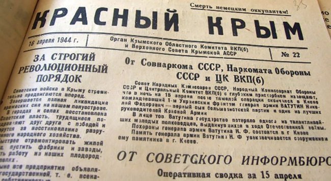 Первый номер нашей газеты, вышедший уже в освобождённом Крыму, до этого номера выпускались на Кавказе. Фотокопия автора. Оно врывалось в города и селения полуострова, долгожданное, выстраданное, вымоленное и заслуженное освобождение! И усталые улыбки бойцов, что дарили его крымчанам, дарили неимоверной ценой - своих жизней, сил… Усталые, но искренние улыбки, словно тысячи солнышек согревали тогда промёрзший в фашистской оккупации Крым. Старожилы вспоминают, что погода все два с половиной года пока нацисты лютовали здесь, особо не радовала - словно и природа старалась досадить врагу, ведь получилось же и в 1812-м в Москве, и в 1942-м в Сталинграде подсобить холодом нашим бойцам, ко всему привычным. Впрочем, та промёрзлость была совсем непогодная для крымчан. Холодило от осознания, что по твоей земле ходят враги; комендантский час и виселицы на улицах, а казнить могут просто так, в усладу, на спор; и тысячи земляков уже ушли в вечность, соседей, друзей, знакомых - то не та, по мнению фашистов, национальность, то просто непокорность подвела. И как же все эти годы согревали, придавали сил листовки, диверсии земляков подпольщиков, боевые дела партизан; наша газета, тогда «Красный Крым», Евгения Степанова и Абрама Райчука, не прекращавшая выходить все годы оккупации, и смелые лётчики сбрасывали её номера над родным полуостровом. И как враз, до последнего миллиметра, согревали всё, растапливали ужас, страх оккупации весточки, что освободители уже здесь, на подходе! Как радовали взгляд алые знамёна, наши ватники, ушанки, пилотки и звёзды на броне, как радостно было слышать даже крепкие мужские слова (тогда это была не брань вовсе, а необходимая музыка освобождения). И те улыбки бойцов, усталые, но искренние - Крымская наступательная операция. «Наступательные бои» Её называют ещё «Третьим Сталинским ударом» (всего 10 было, освободительных, победных) - решение о наступлении, окончательном, мощном, Ставка верховного главнокомандования во главе с Иосифом Сталиным приняла 16 марта 1944-го. Атаковать планировали в конце марта, но непогода вмешалась, шторм, морозы, снежные завалы, зато как только началась распутица… Напряжённое сумрачное утро 8 апреля зазвучало тысячным многоголосием нашей артиллерии на Перекопе и Сиваше, плацдармах, что ценой тысяч жизней с ноября 1943-го занимали и держали наши советские солдаты, форсировавшие залив, шедшие в Керченско-Эльтигенском десанте. Тогда, в апреле, Крымскую весну 1944-го несли бойцы 4-го Украинского фронта Фёдора Толбухина, в составе 19-го отдельного танкового корпуса Ивана Васильева, после его ранения - Ивана Поцелуева, 2-й гвардейской армии Георгия Захарова, 51-й армии Якова Крейзера (в зимнем десанте - Алексея Первушина), а также Отдельной Приморской армии Андрея Ерёменко, затем Кондрата Мельника, 4-й, Константина Вершинина, и 8-й, Тимофея Хрюкина, воздушных армий, Черноморского флота Филиппа Октябрьского и Азовской военной флотилии Сергея Горшкова. И наши земляки здесь, надёжная помощь в пока ещё вражеском тылу - подпольщики и партизаны: Северное соединение Павла Ямпольского, Восточное - Владимира Кузнецова и Южное - Михаила Македонского. Приказ комфронтом Фёдора Толбухина - «Освободить жемчужину нашей страны, Советский Крым, от ярма немецко-румынской кабалы», сердцем приняли все. А для него лично это было делом чести: 